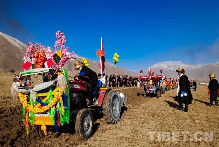 據(jù)悉,儀式當日上午,村民們會身著節(jié)日盛裝,歡聚在田間地頭、載歌載舞隆重舉行春耕春播儀式?;顒蝇F(xiàn)場,姑娘們舉起手中的切瑪、青稞酒、人參果為犁手們唱歌敬酒,在祝福的歌聲中,開啟春耕“第一犁”。在西藏,過去是牦牛耕地,如今,隨著農業(yè)科學化發(fā)展,現(xiàn)在農耕都用現(xiàn)代化的拖拉機“鐵?!备?。一般吉時一到,一個個犁手頭頂金黃圓筒帽,身穿氆氌藏裝駕著一輛輛插著五星紅旗,系著潔白哈達的“鐵牛”緩緩駛進田間,一片片沃土隨著鐵犁慢慢翻開,婦女們在后面播撒青稞良種……在田埂上形成一道最靚麗的風景線,好不壯觀!