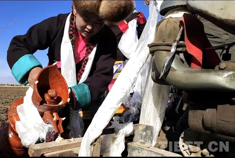 在雪水浸潤過的肥沃土地上,深耕機車輪翻滾而過,駛過的土地上翻起深色的泥土,婦女們跟在后面播撒青稞良種。現(xiàn)場一片轟鳴,熱鬧無比,廣袤、肥沃的土地上播種下了春天的希望。