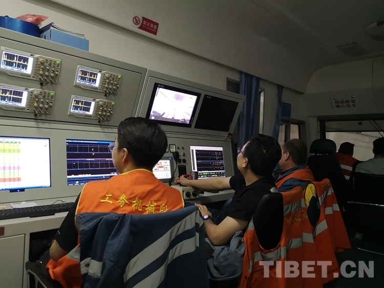 進(jìn)入拉林鐵路前,機(jī)組人員對鋼軌探傷車檢測裝置、走行及制動(dòng)系統(tǒng)進(jìn)行了細(xì)致的檢查,對探傷系統(tǒng)及參數(shù)等進(jìn)行調(diào)試。探傷車前端,兩名司機(jī)緊盯前方,負(fù)責(zé)運(yùn)行;探傷操作臺(tái)前,副隊(duì)長張全福及4名探傷人員不斷調(diào)整相關(guān)參數(shù),連續(xù)6個(gè)小時(shí)對檢測過的鋼軌數(shù)據(jù)進(jìn)行認(rèn)真盯控,通過數(shù)據(jù)變化判斷鋼軌是否存在傷損。