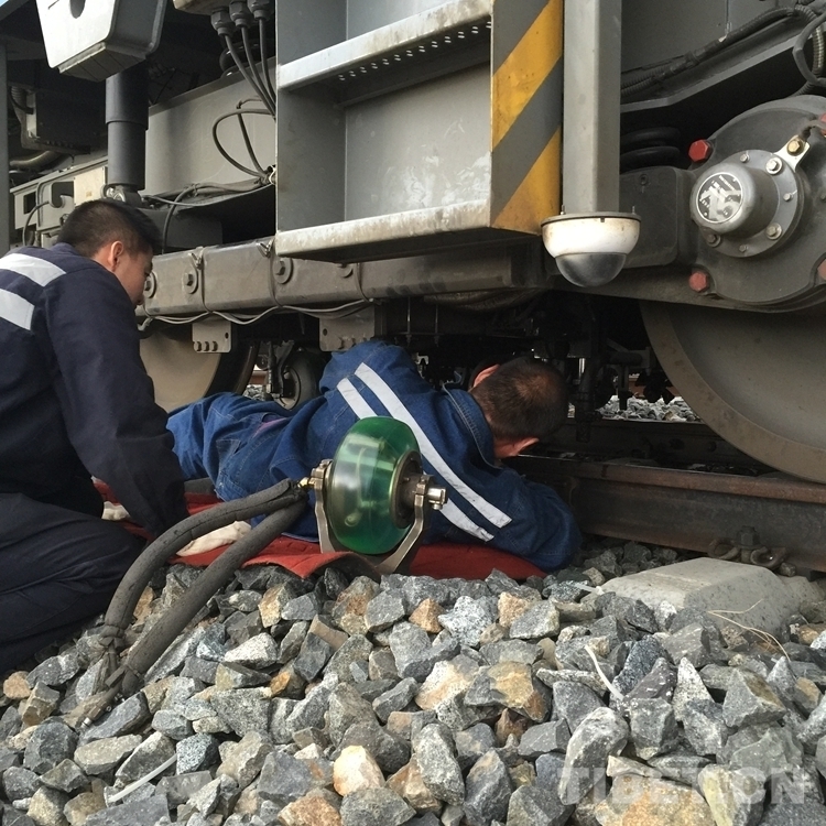 即將達(dá)到加查站時(shí),探傷員余賢明發(fā)現(xiàn)探傷車左側(cè)第2個(gè)探輪有破損現(xiàn)象,需要更換探輪,大家立刻按照分工各就各位。隊(duì)長聯(lián)系集團(tuán)公司調(diào)度、加查站安排探傷車??寇囌?,設(shè)置好防護(hù)后,李生紅和余賢明立即鉆到車下拆卸破損探輪,崔成剛和李慧臣則準(zhǔn)備好新的探輪。四個(gè)人分工協(xié)作,在夜幕降臨之前將新的探輪安裝了上去。