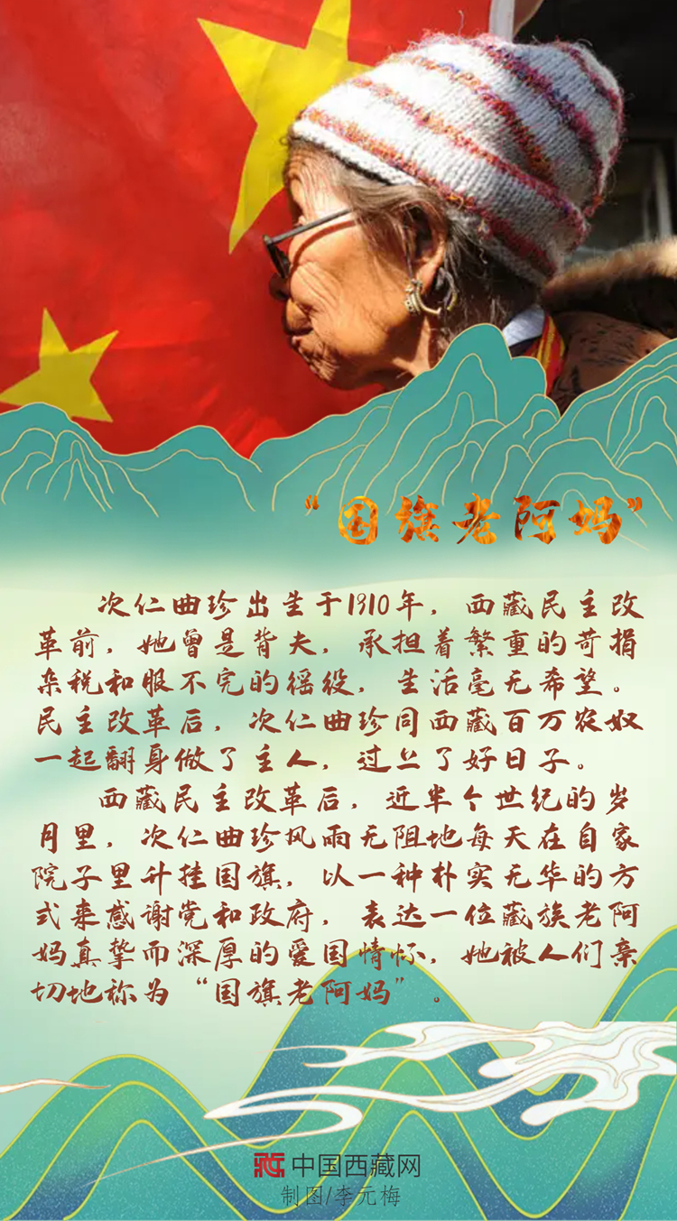 西藏民主改革后,次仁曲珍在自家院子里升起國旗,這一升就是近半個世紀(jì),一天不落,風(fēng)雨無阻。只有經(jīng)歷過舊西藏的人才知道新西藏的可貴,翻身成為國家主人的“國旗老阿媽”,以上萬天堅持不渝的行動表達(dá)著自己樸素的愛國情懷。