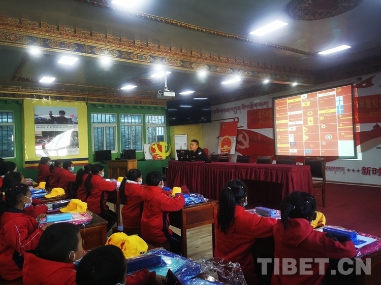 圖為西藏林芝金東邊境派出所民警在朗縣國(guó)門(mén)講習(xí)所為當(dāng)?shù)匦W(xué)生們帶來(lái)愛(ài)國(guó)主義小課堂 攝影:徐華升