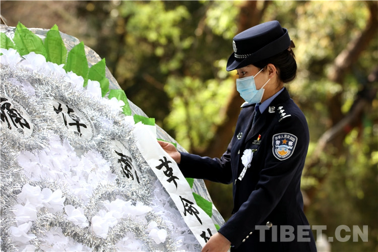 圖為民警為烈士敬獻花圈后整理挽聯(lián) 攝影:鄒興國