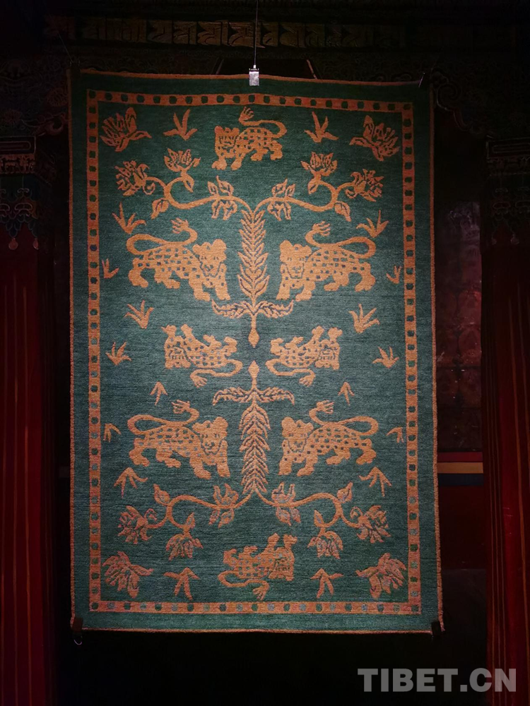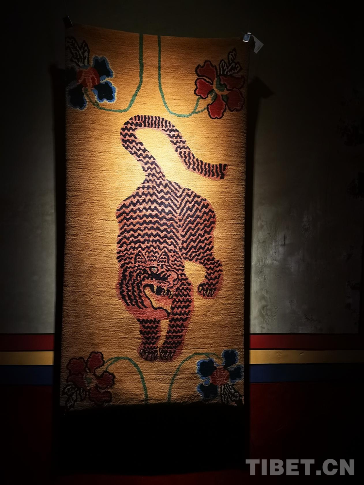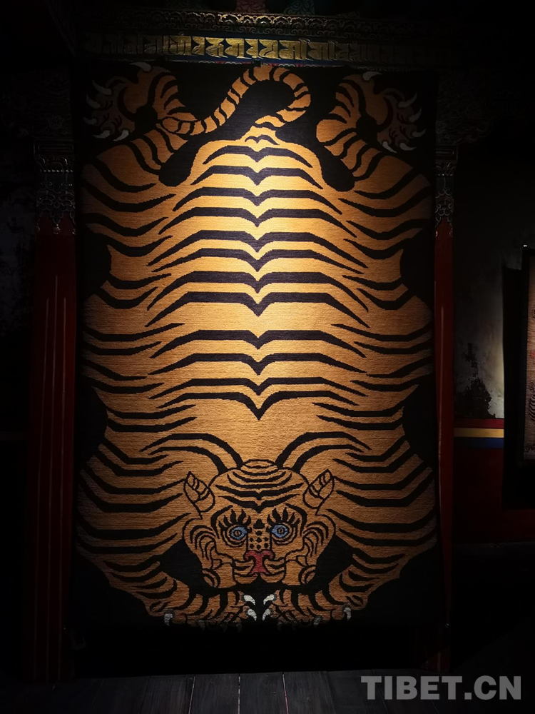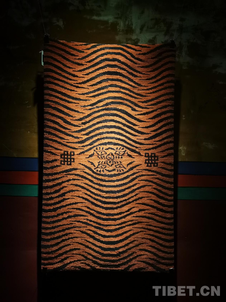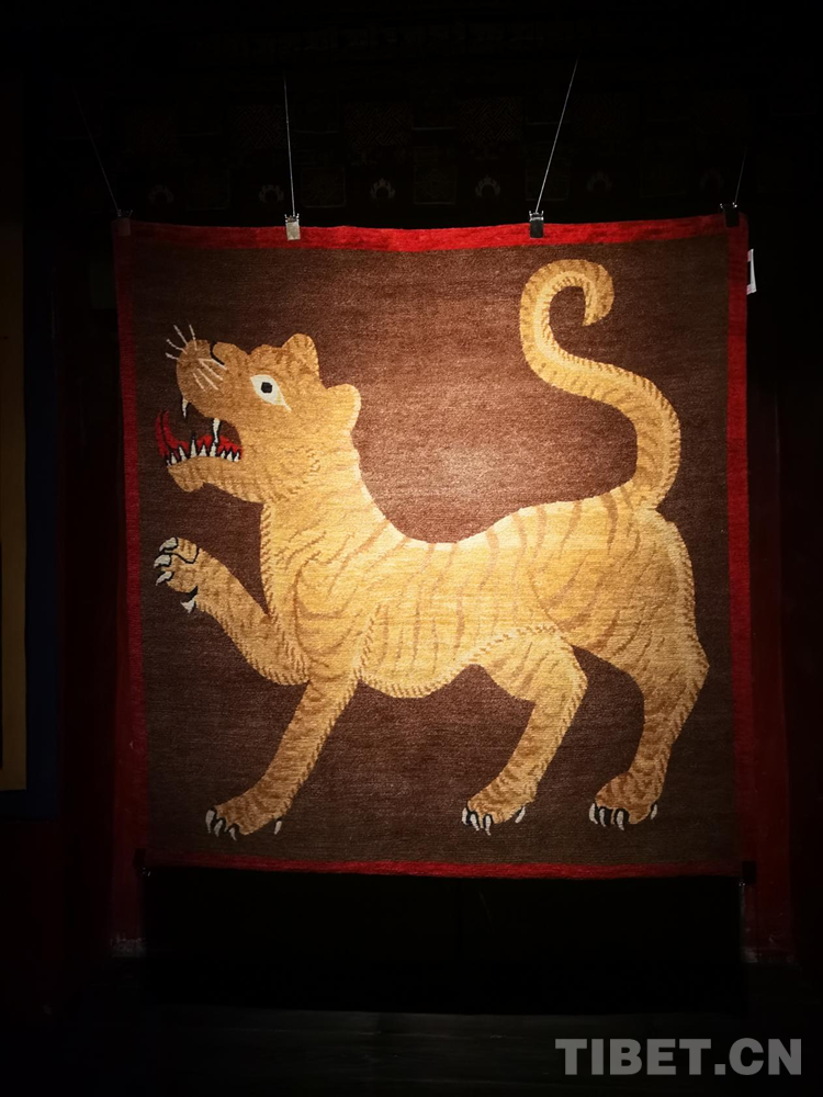 生活在不同地區(qū)的中華民族先民們都不約而同地有著對(duì)虎的崇拜和描繪。據(jù)了解,“云從龍,風(fēng)從虎”在中國(guó)古代先秦時(shí)期,虎一度與龍并列而成為權(quán)力和力量的象征。根據(jù)相關(guān)文獻(xiàn)記載,早在5000年前,西藏阿里地區(qū)的居住者就將虎皮紋飾等符號(hào)刻在巖石上;公元7世紀(jì)前后,松贊干布曾頒布《三十六制》,提到“虎皮褂、虎皮裙、虎皮袍”等成為“六勇飾”,只有獲得地位和相當(dāng)成就的人才能佩戴,虎的圖案也自此融入地毯等西藏織物中。