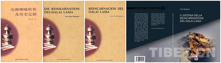 圖片分別為陳慶英著《達賴喇嘛轉(zhuǎn)世及歷史定制》漢文版、德文版、英文版封面和意大利文版封面封底