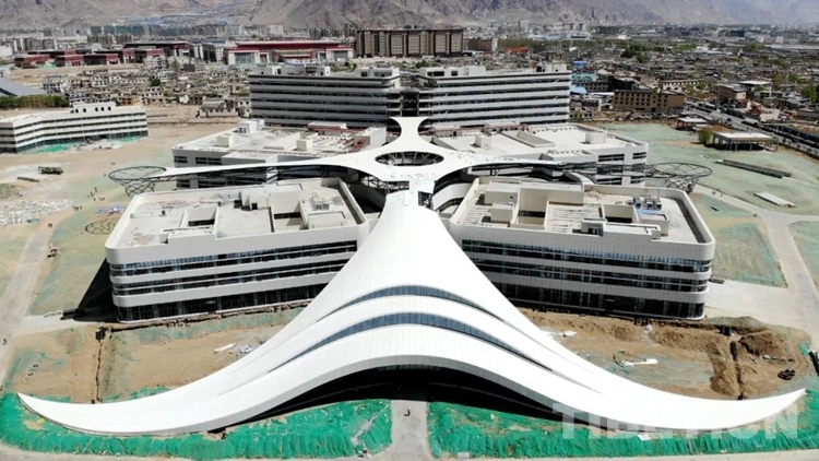 圖為從空中俯瞰西藏自治區(qū)醫(yī)院項(xiàng)目施工現(xiàn)場