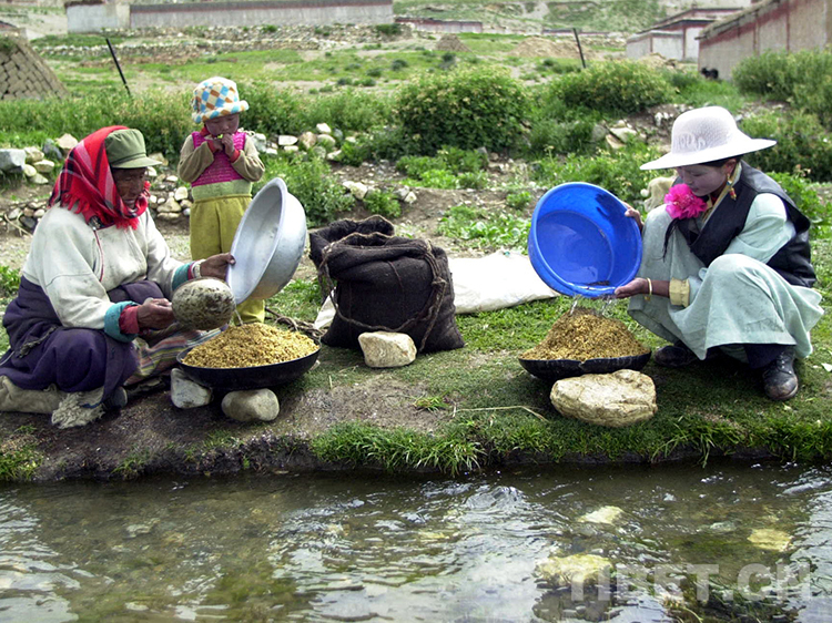 這是尼瑪縣文部鄉(xiāng)南村的藏族婦女在淘洗準備磨糌粑的青稞(唐召明2001年7月11日攝)