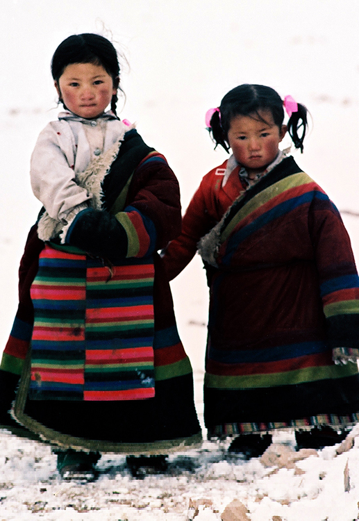 那是1989年歲末最后幾天,我隨藏北那曲地區(qū)(現(xiàn)那曲市)基層政權(quán)建設(shè)工作現(xiàn)場會“訪問團”來到文部辦事處(現(xiàn)尼瑪縣)參觀。來到卓瓦鄉(xiāng)時,我眼前突然一亮:在雪地上玩耍的草原小姐妹,三五歲的樣子,身著五彩羔皮藏袍,扎著羊角小辮,臉頰上印刻著深紫色“高原紅”。那是草原上一道最美麗的風(fēng)景線,我不由得按動手中相機快門……