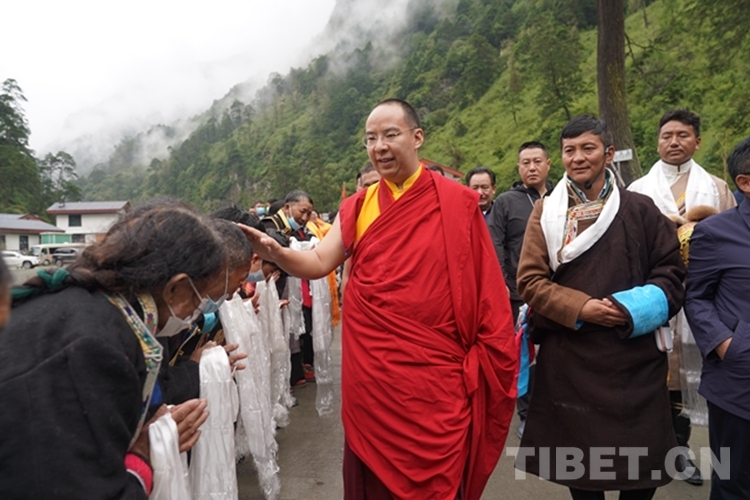 調(diào)研結(jié)束,班禪徒步走出珞瓦新村,為村口列隊(duì)歡送的信教群眾一一摸頂賜福,并給村內(nèi)所有信教群眾送上了經(jīng)過加持的金剛結(jié)、法相照片和像章。