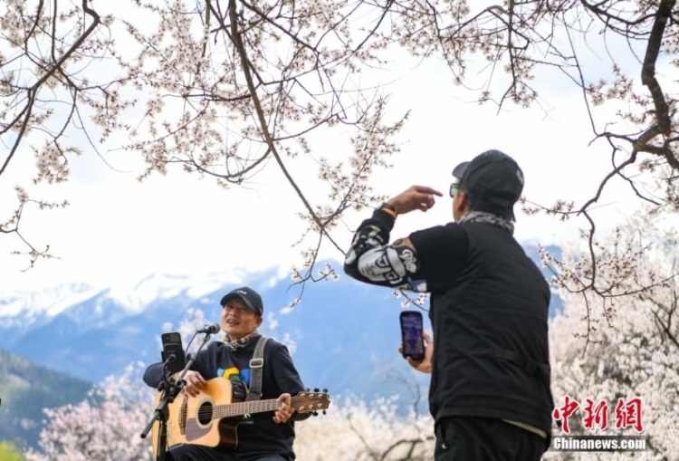 游客在嘎拉村桃樹(shù)下唱歌 中新社 貢嘎來(lái)松/攝
