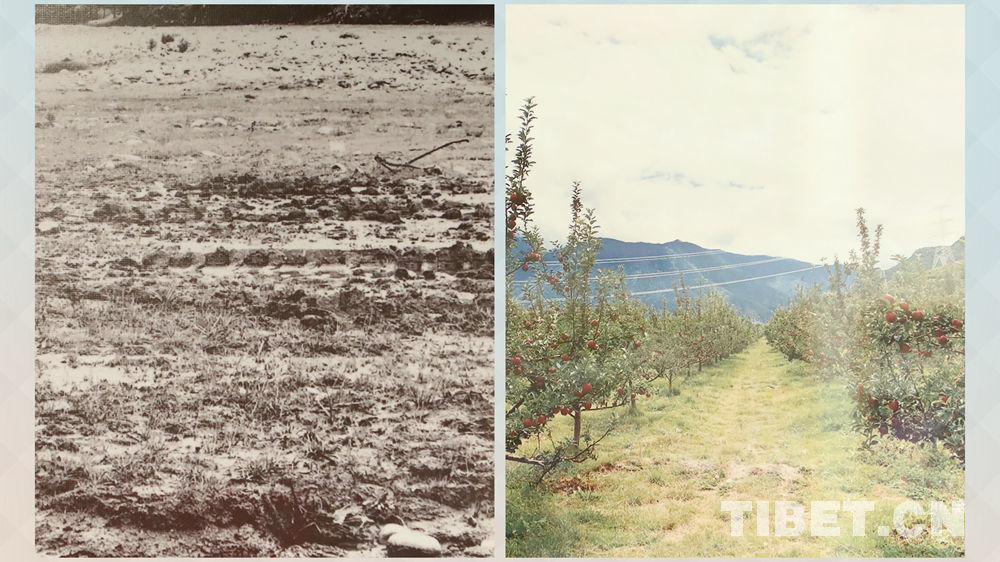 左圖,過(guò)去嘎拉村采摘園改造前的荒地;右圖,現(xiàn)在嘎拉村實(shí)施觀光采摘園項(xiàng)目。 孔夏翻拍自嘎拉村紅色研學(xué)主題教育展覽館