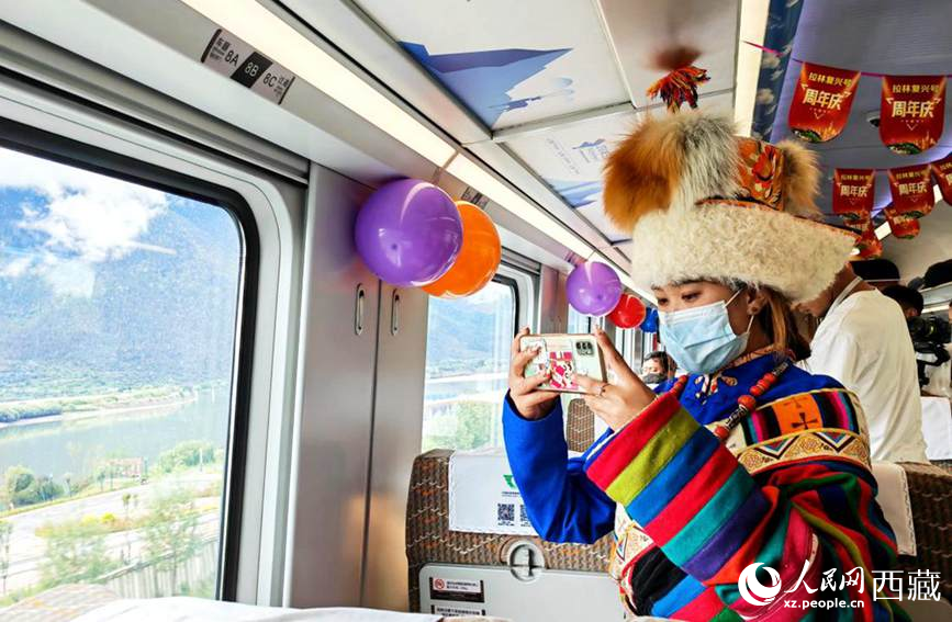 圖為拉林鐵路開(kāi)通一周年,游客用手機(jī)拍下沿途風(fēng)景。人民網(wǎng) 李海霞/攝