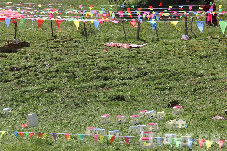 圖為2022年伊日鄉(xiāng)第二屆文化旅游藝術(shù)節(jié)上,前來(lái)參加的群眾在搭建帳篷,旁邊是“用好你的手 垃圾無(wú)處留”的標(biāo)語(yǔ) 攝影:王茜
