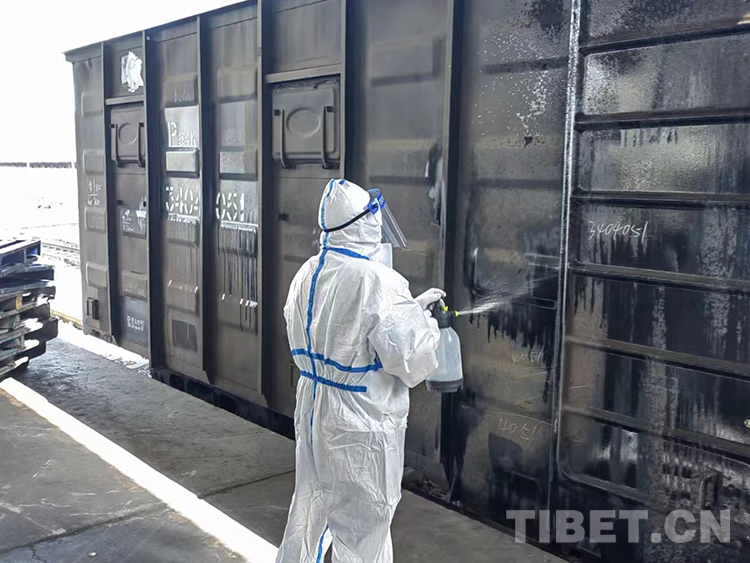 圖為拉薩車(chē)務(wù)段工作人員對(duì)到站物資進(jìn)行消殺