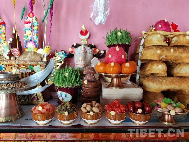 圖為藏歷新年期間擺放的切瑪盒等,其中盛放各類干果的酥油茶碗由中央代表團(tuán)贈送 攝影:歐帆