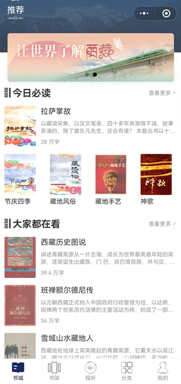“掌讀西藏”為讀書公益類平臺(tái),免費(fèi)向讀者提供中國西藏主題的電子圖書。目前有《古格王國》《神歌》《達(dá)賴?yán)镛D(zhuǎn)世制度》《班禪額爾德尼傳》《拉薩掌故》《雪域山水藏地人》《節(jié)慶四季》《西藏歷史圖說》《進(jìn)軍西藏日記》等29本電子圖書。這些電子圖書都是作者寶貴的知識(shí)結(jié)晶,也是對(duì)中國西藏珍貴的歷史記憶,濃縮了幾代人見證中國西藏發(fā)展的時(shí)代烙印。