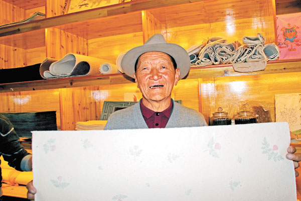 到了上世紀90年代,國家開始搶救這些瀕危的民族手工業(yè)技藝,次仁多杰看著越來越多的人參與到藏紙的搶救工作中來,堅定了繼續(xù)做下去的信念。1988年,西藏自治區(qū)檔案館為修復西藏古籍,需要大量藏紙,次仁多杰制作的雪拉藏紙就完全符合需求。此后,他與檔案館簽訂了為期18年的藏紙供應合同。