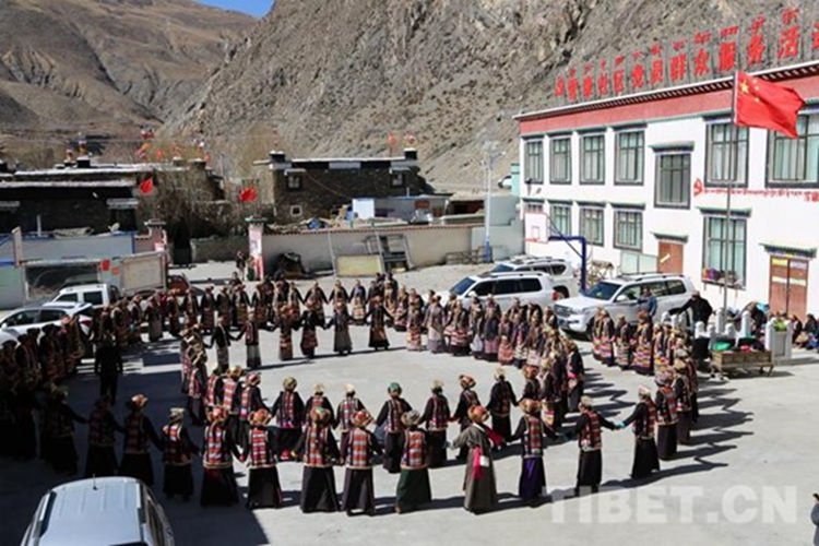 圖為2019年西藏自治區(qū)山南市瓊結(jié)鎮(zhèn)雪康社區(qū)婦女跳果諧慶祝“三八”婦女節(jié)