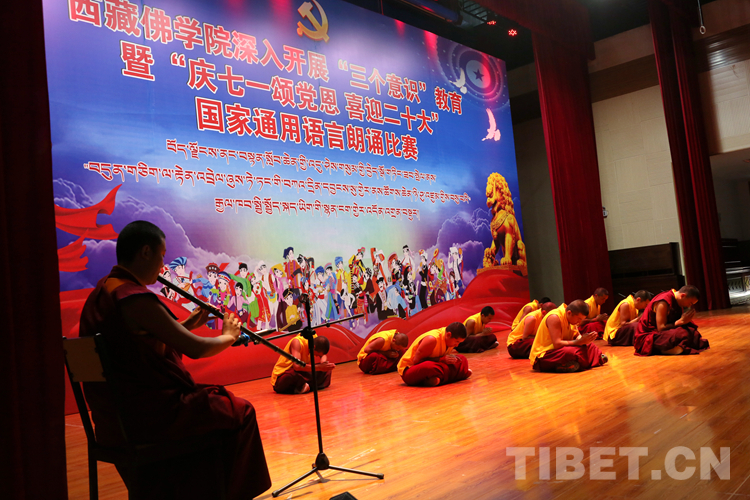 圖為2022年7月1日,西藏佛學(xué)院舉行的“慶七一頌黨恩 喜迎二十大”國(guó)家通用語(yǔ)言朗誦比賽現(xiàn)場(chǎng)由2021級(jí)學(xué)制班學(xué)員表演笛子獨(dú)奏《我愛(ài)你中國(guó)》和瑜伽表演 攝影:王佳豪
