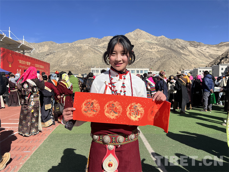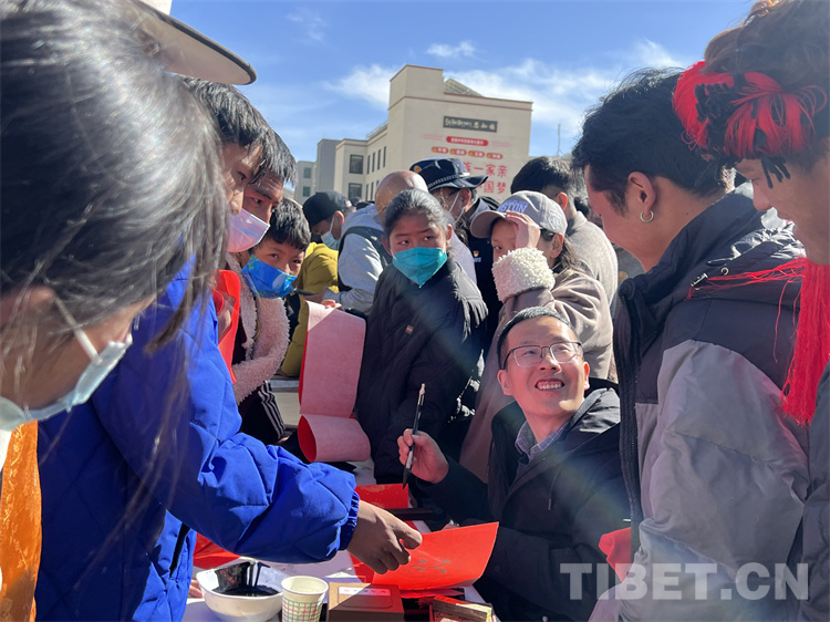 來到送“書法”現(xiàn)場,書法家們?cè)缭绲貋淼交顒?dòng)現(xiàn)場,他們準(zhǔn)備筆墨、鋪開紙張,為現(xiàn)場群眾書寫藏、漢文新年對(duì)聯(lián),“?!弊?、“吉祥如意”、“扎西德勒”等寓意美好的祝福。書法家協(xié)會(huì)副主席祖牛拉巴次仁說:“從春節(jié)開始,我們書法家們?nèi)W(xué)校、社區(qū)、搬遷安置點(diǎn)等地,書寫了超過1萬件的書法作品。這些作品深受大家的喜愛,我們后續(xù)也會(huì)繼續(xù)開展送‘書法’公益活動(dòng)”?,F(xiàn)場群眾聚集在送“書法”現(xiàn)場,“西熱措姆”“張文青”“索朗旺青”“朗嘎達(dá)瓦”……孩子們爭先恐后請(qǐng)書法家把自己的名字寫在紅紙上?!斑@是我的名字,我爸是西寧人,我媽是那曲的,我們是從那曲安多縣搬遷過來的,我現(xiàn)在在森布日幸福中學(xué)上初三,將來要考那曲高級(jí)中學(xué)”張文青拿著書家贈(zèng)給她的“名字”用流利的那曲話對(duì)記者說。
