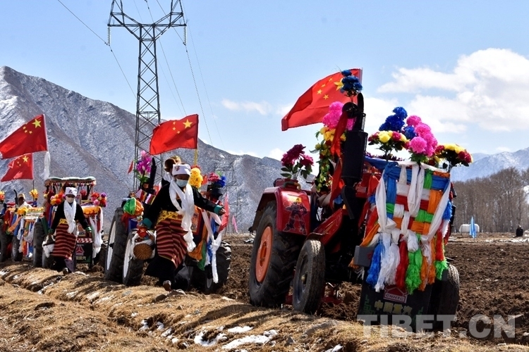 在雪水浸潤過的肥沃土地上,深耕機(jī)車輪翻滾而過,駛過的土地上翻起深色的泥土,婦女們跟在后面播撒青稞良種。