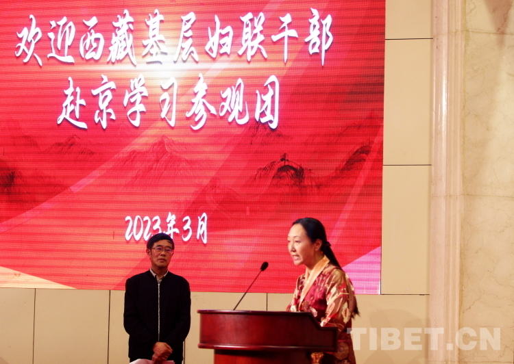 圖為西藏自治區(qū)婦聯(lián)黨組成員、副主席澤仁卓嘎(右一)在北京建藏援藏工作者協(xié)會在北京西藏大廈為“2023年西藏基層婦聯(lián)干部赴京學(xué)習(xí)參觀團(tuán)”成員們舉行的歡迎會上發(fā)言 攝影:劉莉