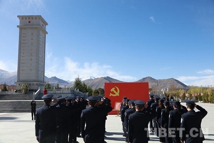 圖為西藏邊檢總站執(zhí)法調(diào)查支隊民警在烈士紀(jì)念碑前重溫入黨誓詞