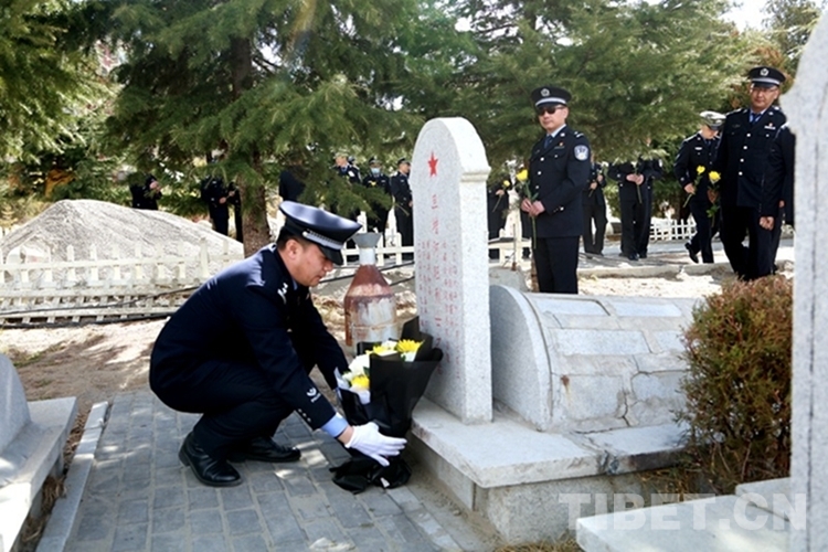圖為西藏邊檢總站執(zhí)法調(diào)查支隊民警為旦增阿旺烈士擦拭墓碑、敬獻(xiàn)鮮花