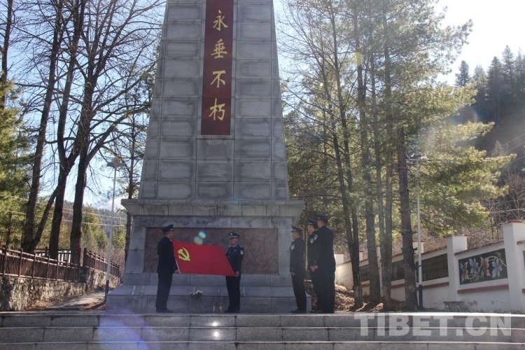 圖為西藏邊檢總站執(zhí)法調(diào)查支隊(duì)執(zhí)法調(diào)查七隊(duì)民警在亞?wèn)|革命烈士陵園烈士紀(jì)念碑前對(duì)黨旗宣誓 攝影:李渠成