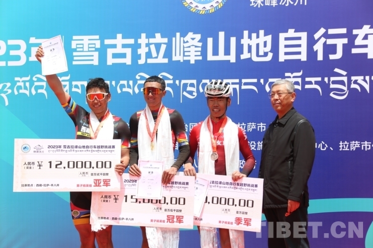 圖為獲得男子精英組冠軍西藏亞車隊選手江村羅布、亞軍西藏亞車隊扎頓、季軍拉薩朋友車隊選手索朗 攝影:德吉卓瑪