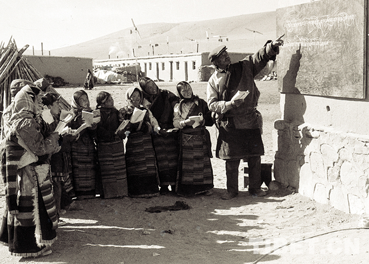 圖為雙湖辦事處(現(xiàn)那曲市雙湖縣)嘎措鄉(xiāng)小學教師巴多在給學生上課(唐召明1988年攝)
