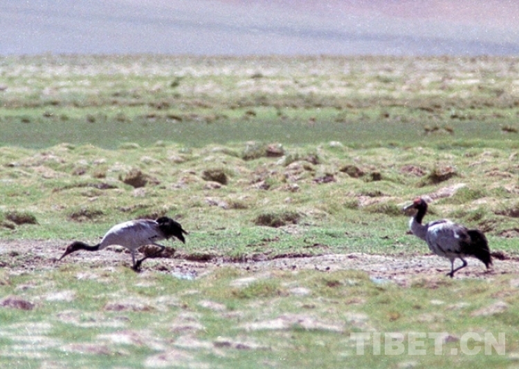 這是兩只漫步在藏北色林錯(cuò)國(guó)家級(jí)自然保護(hù)區(qū)的國(guó)家一級(jí)保護(hù)動(dòng)物、被稱為“鳥(niǎo)類熊貓”的黑頸鶴(唐召明2001年攝)