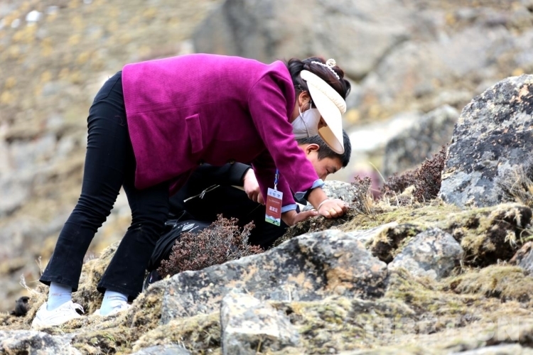 圖為游客在當?shù)厝罕姷膸ьI(lǐng)下尋找蟲草 攝影:王佳豪