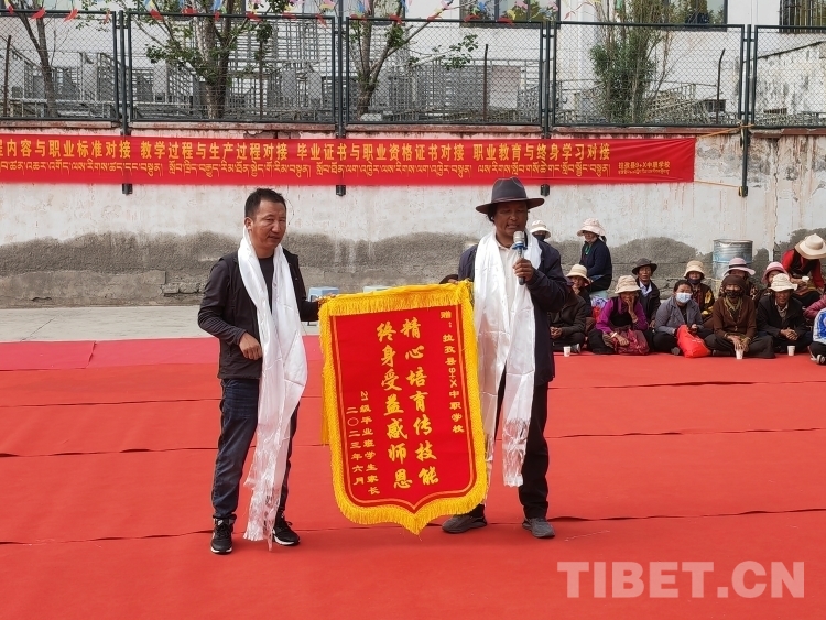 活動(dòng)現(xiàn)場(chǎng),學(xué)生家長(zhǎng)代表向?qū)W校贈(zèng)送錦旗并發(fā)表感言。“感謝拉孜縣9+X中職學(xué)校培養(yǎng)了我的孩子,經(jīng)過(guò)學(xué)校的精心培養(yǎng),讓家人操碎心的孩子如今依靠從學(xué)校學(xué)到的技藝找到了一份滿意的工作,這讓我一家人感到很欣慰。”學(xué)生家長(zhǎng)代表白瑪有感而發(fā),“希望在場(chǎng)的孩子們也通過(guò)發(fā)揮自己的優(yōu)勢(shì),在社會(huì)上找到一份心儀的工作,同時(shí)真心祝福學(xué)校越辦越好?!?/p>