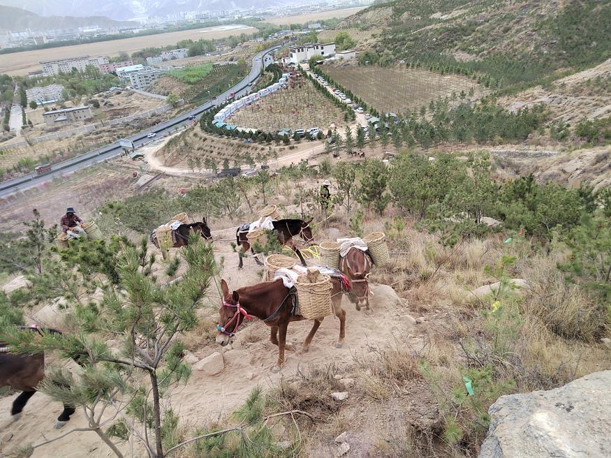 圖為騾隊(duì)在綠化片區(qū)運(yùn)輸樹苗 圖片來源:西藏自治區(qū)慈善總會官網(wǎng)