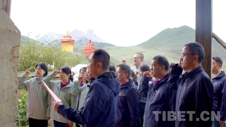 圖為“同心·共鑄中國心”昌都行第十一團在洛隆縣重于泰山烈士紀念碑前重溫入黨誓詞,開展主題黨日活動。(洛隆融媒提供)