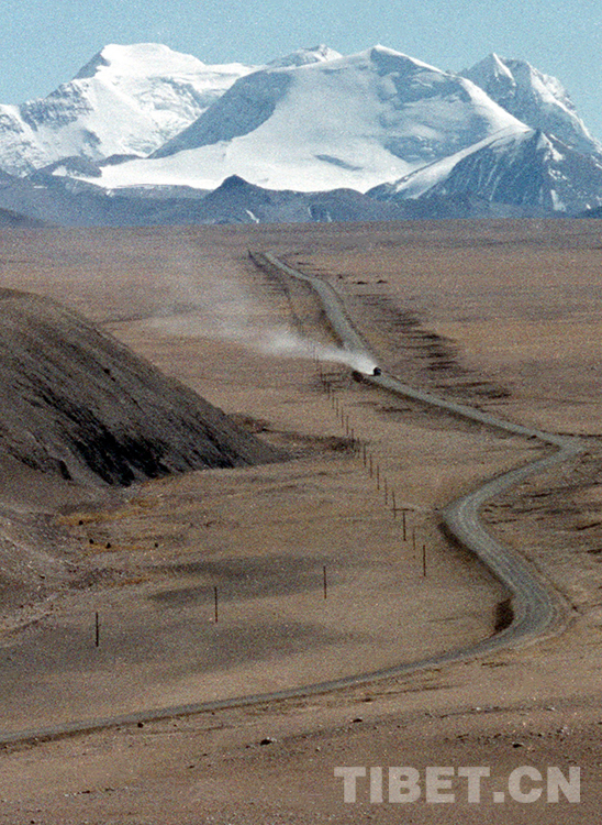 唐古拉山雪山下的青藏公路(唐召明1985年攝)