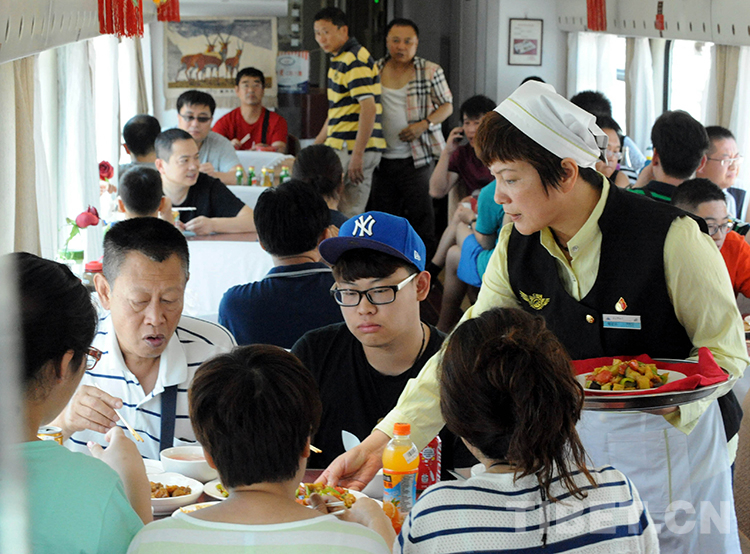 北京鐵路局北京客運(yùn)段京藏車隊(duì)副隊(duì)長彭海燕在北京開往拉薩的餐車上為就餐旅客服務(wù)(唐召明2014年7月5日攝)