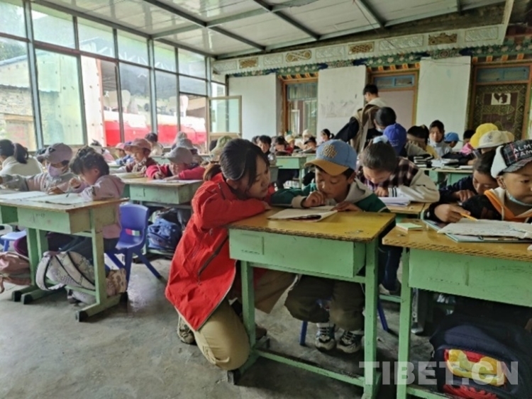 圖為人文科考隊員輔導(dǎo)孩子做作業(yè)