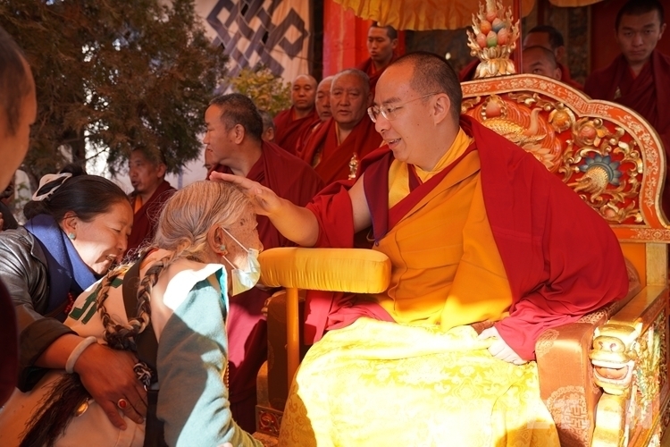 71歲的次仁曲珍老家在日喀則市拉孜縣,當(dāng)天在女兒的陪伴下拄著拐杖來(lái)到扎什倫布寺等候班禪摸頂賜福??吹嚼习屄呓?,班禪露出關(guān)切的神情,俯身向前,雙手接過(guò)哈達(dá)掛在老人的脖子上,輕輕為她摸頂,并祝福老人健康長(zhǎng)壽。