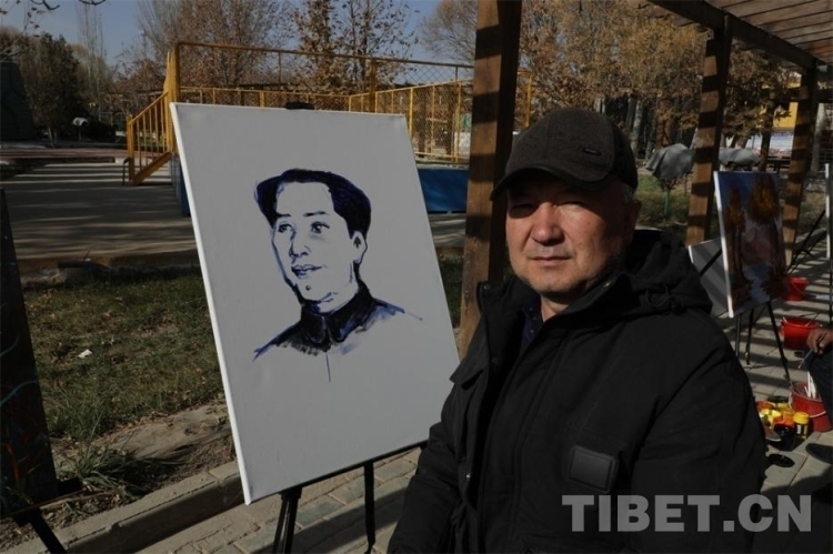 來到作畫區(qū)域,首先吸引記者注意的便是身穿黑衣、頭戴灰帽的西爾艾力·艾買提老人。在雪白的畫布前,老人用藍(lán)色和墨色顏料深淺描繪,勾勒出我們最熟悉的面孔。他向我們介紹說:“我畫的是我們偉大的毛主席年輕時(shí)候。沒有毛主席,我們中國人的生活不是這個(gè)樣子的,我很感恩他。我畫毛主席就是想讓更多人看見,讓他的故事得到更好的緬懷?!?/span>