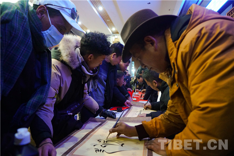 圖為春運(yùn)首日拉薩站向旅客免費(fèi)贈(zèng)送漢藏春聯(lián)及書(shū)法作品 攝影:趙振宇