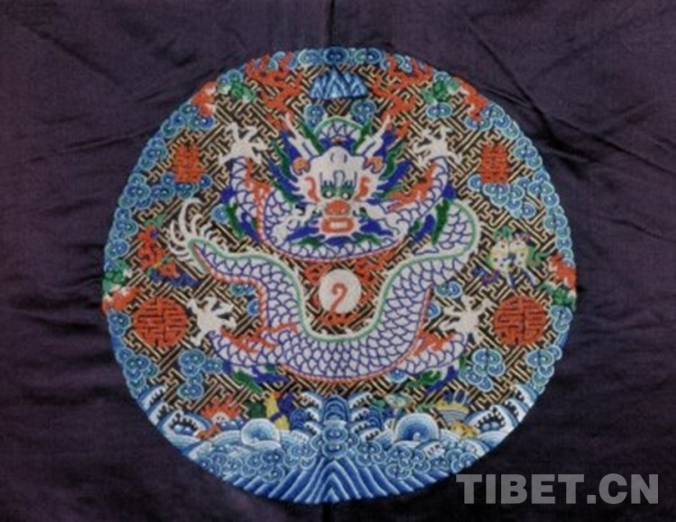 褂圓領(lǐng),對襟,平袖,裾后開。褂用二至四色暈法,在石青色緞地上以平針、套針、平金等針法及緝米珠工藝彩繡、穿綴萬字地八團(tuán)彩云白龍紋、海水江崖及雜寶等紋樣。袍內(nèi)襯月白色祥云團(tuán)龍壽字織金緞里。袖口沿鑲石青萬字織金緞邊。領(lǐng)口綴銅鎏金鏨花扣一,余綴石青色織金緞扣袢四。
