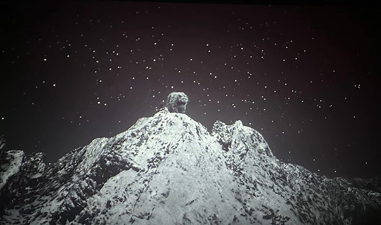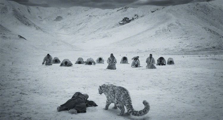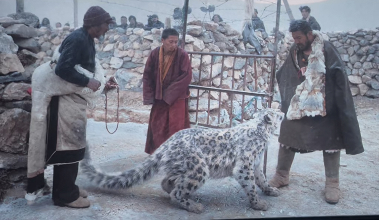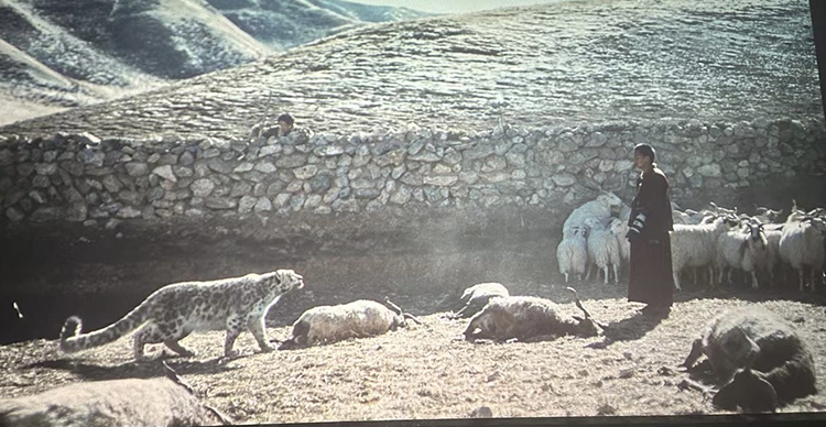 影片的結(jié)尾似乎很突然,雪豹終究沒(méi)有死在受損牧人暴怒的情緒和揮舞的錘子下,在人類文明的關(guān)照下,被主動(dòng)解圍,回歸雪山,與小雪豹相會(huì)相伴。只有萬(wàn)導(dǎo)這種深邃包容、沉著冷靜又充滿睿智的作家、藝術(shù)家才能挖掘和表現(xiàn),這里蘊(yùn)含著生命的慈悲和世人的智慧。對(duì)此,我們還有哪些拷問(wèn)呢?