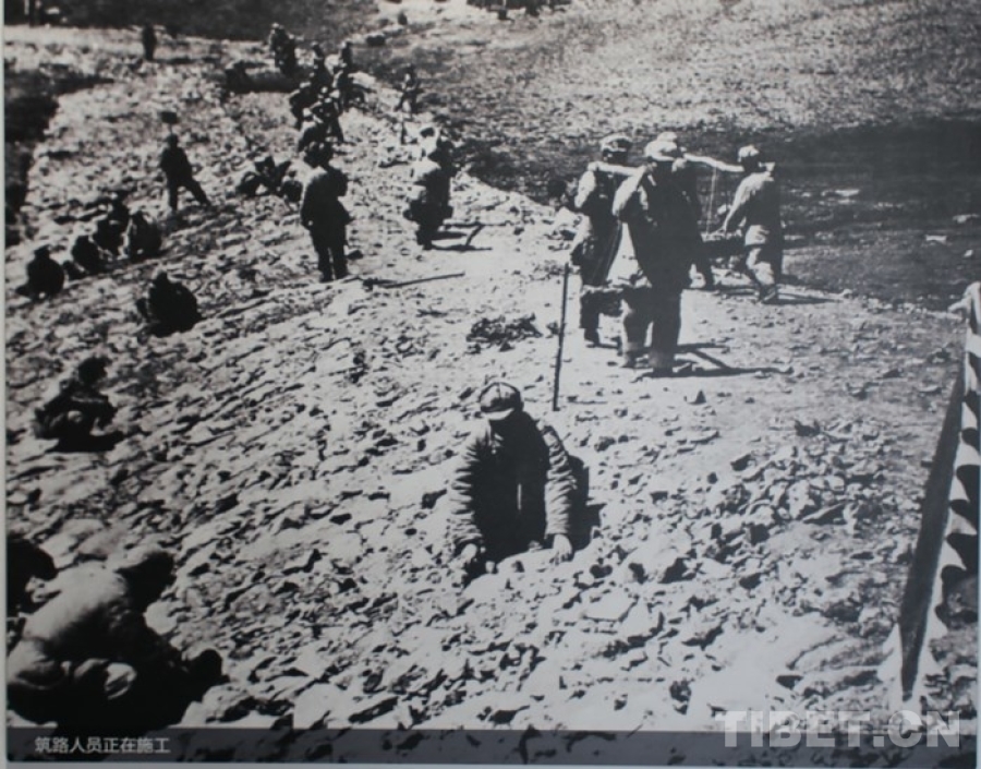 圖為青藏公路紀念館中展出圖片:筑路人員正在施工 翻拍:王茜