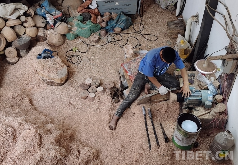 我們首先來到的是四川省非物質(zhì)文化遺產(chǎn)項目——藏族民間車模技藝體驗(yàn)基地?;匾粚邮枪ぷ鲄^(qū),一位師傅正在全身心制作木質(zhì)生活用具,絲毫沒有察覺我們的到來。于是沒有過多打擾,我們徑直來到二樓展品陳列區(qū)。藏族民間車模技藝傳承人格絨次仁的兒子洛絨次仁拿起一個木碗,臉上露出樸實(shí)而靦腆的微笑介紹道,“這些都是選用樹瘤制作而成,一般選用鵝掌木、杜鵑等15類樹木,因?yàn)橹蹦救菀琢验_。為了用具不裂開,處理后的樹瘤煮水后需晾干五至六個月,一個木碗制作工序可能要長達(dá)半年才能完成。此項技藝在家族傳承至今已有四代,我們要做就做好一點(diǎn)?!甭褰q次仁大哥希望更多人能了解這項非物質(zhì)文化遺產(chǎn),有更多人愿意來傳承學(xué)習(xí)這份技藝,有更多人喜歡他們制作的這些木質(zhì)生活用具。