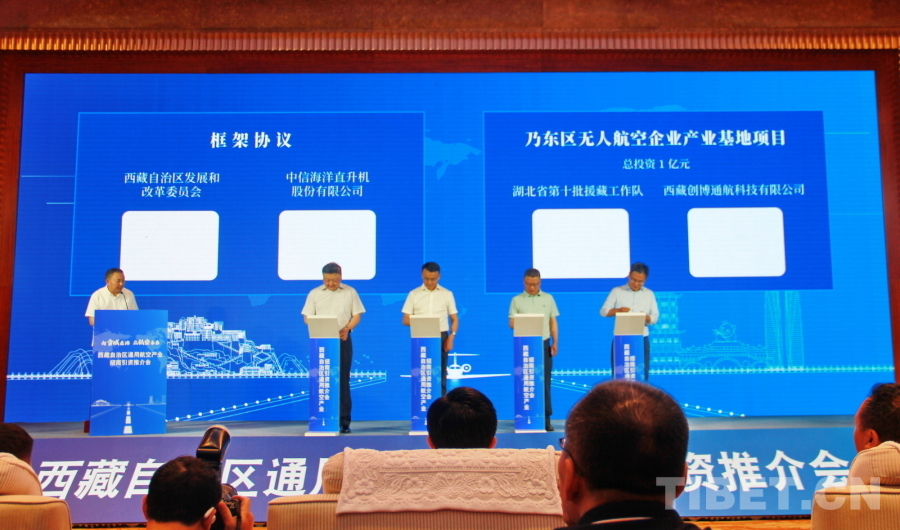 據(jù)介紹,本次推介會突出培育和發(fā)展“通用航空+”新業(yè)態(tài)和招商引資項目合作兩個重點。旨在搭建交流合作平臺,按照西藏自治區(qū)黨委、政府關于大力發(fā)展通用航空產(chǎn)業(yè)的安排部署,優(yōu)化完善通用機場布局和通用航空運營網(wǎng)絡,全面建設“布局合理、功能清晰、層次分明、規(guī)模適當”的通用航空服務體系,加快提升西藏通用航空供給側(cè)保障能力,為全面建設社會主義現(xiàn)代化新西藏提供強力支撐。推介會上,西藏自治區(qū)發(fā)展和改革委員會與中信海洋直升機股份有限公司,湖北省第十批援藏工作隊與西藏創(chuàng)博通航科技有限公司,扎囊縣人民政府與湖南卓譽科技有限公司,加查縣人民政府與加查縣御補堂健康科技有限責任公司,西藏自治區(qū)投資促進局與四川一諾通用航空有限公司、大有農(nóng)業(yè)(北京)有限公司進行了簽約。