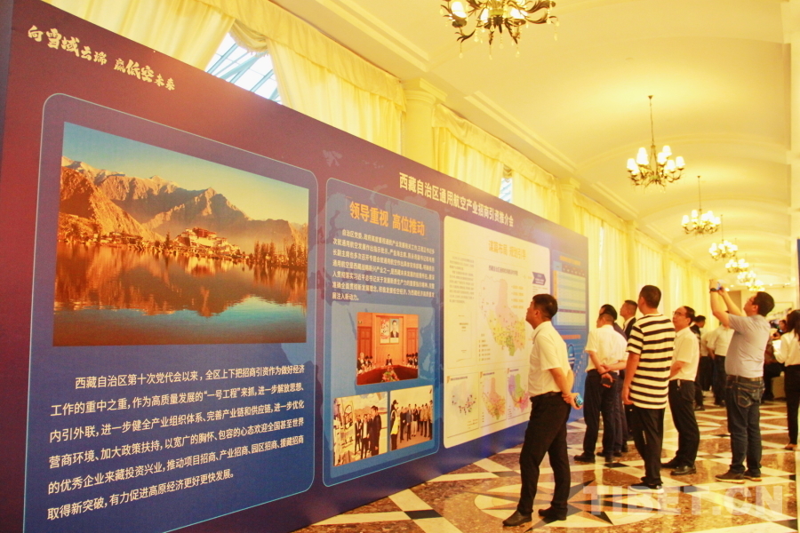 圖為西藏自治區(qū)通用航空產(chǎn)業(yè)招商引資推介會現(xiàn)場設置的展板吸引與會嘉賓駐足了解 攝影:劉莉