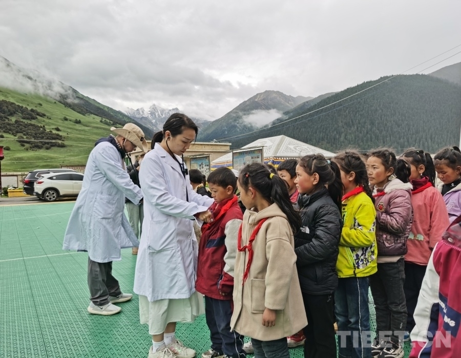 圖為醫(yī)療專家團隊在巴塘縣波密鄉(xiāng)格木村中心小學開展先心病篩查聽診工作 攝影:白瑪司郎