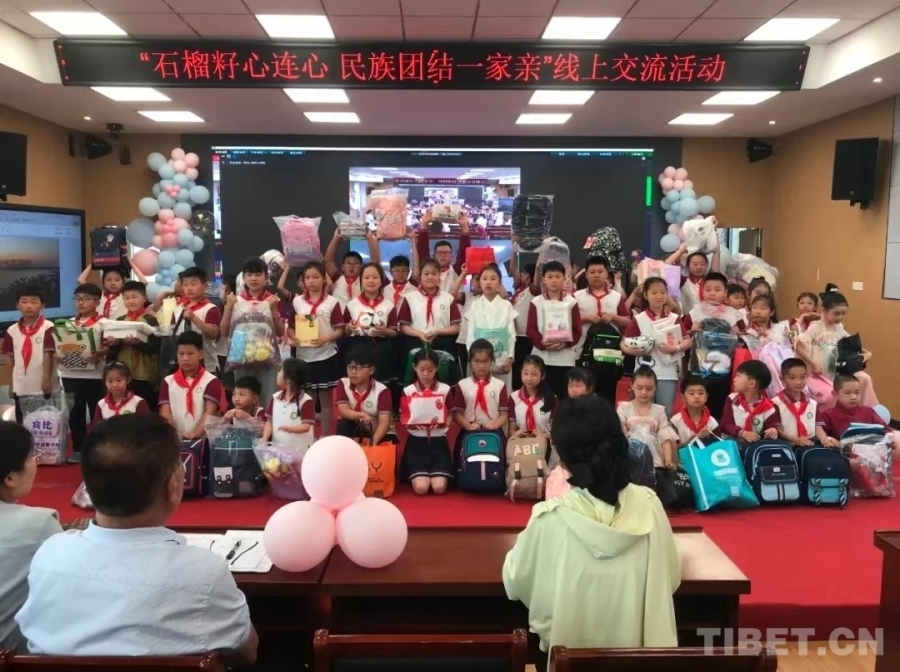 圖為安徽明光市逸夫小學與西藏浪卡子縣浪卡子鎮(zhèn)小學開展“石榴籽心連心民族團結一家親”線上交流活動